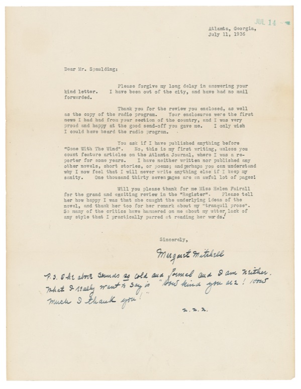 TLS, one page, 8.5 x 11, July 11, 1936. Mitchell writes to Mr. Spaulding. In part: “Thank you for the review you enclosed, as well as a copy of the radio program. Your enclosures were the first news I had had from your section of the country, and I was very proud and happy at the good send-off you gave me. I only wish I could have heard the radio program. You ask if I have published anything before ‘Gone with the Wind.’ No, this is my first writing, unless you count feature articles on the Atlanta Journal, where I was a reporter for some years. I have neither written nor published any other novels, short stories, or poems; and perhaps you can understand why I now feel that I will never write anything else if I keep my sanity. One thousand thirty-seven pages are an awful lot of pages! Will you please thank for me Miss Helen Fairall for the grand and exciting review in the ‘Register.’ Please tell her how happy I was that she caught the underlying ideas of the novel, and thank her too for her remark about my ‘tranquil prose.’ so many of the critics have hammered on me about my utter lack of any style that I practically purred at reading her words!” After signing, Mitchell adds a handwritten postscript, which she signs as “M. M. M.”: “The above sounds so cold and formal and I am neither. What I really want to say is ‘How kind you are! How much I thank you!” Gone with the Wind was officially published less than two weeks earlier, on June 30. Intersecting mailing folds (lightly touching signature), some light creases, and a few very subtle wrinkles, otherwise fine condition. Unusually early content relating to Mitchell’s career and the novel that came to occupy a unique niche in American literature! Auction LOA John Reznikoff/PSA/DNA and R&R COA.