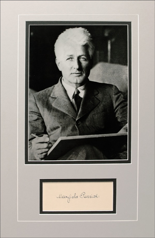 Bold, perfect vintage ink signature, “Maxfield Parrish,” on an ivory 4.75 x 2 card. Matted with a photo to an overall size of 11 x 17. In very fine condition. R&R COA.