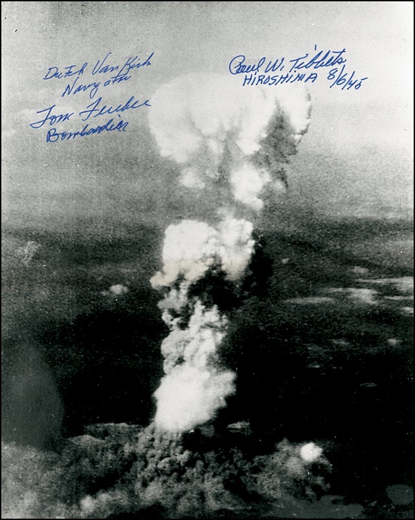 Glossy 8 x 10 photo of the mushroom cloud over Hiroshima, signed in blue felt tip by Paul Tibbets, Tom Ferebee, and Theodore ‘Dutch’ Van Kirk, all adding their assignments after their signature. In very fine condition. R&R COA.