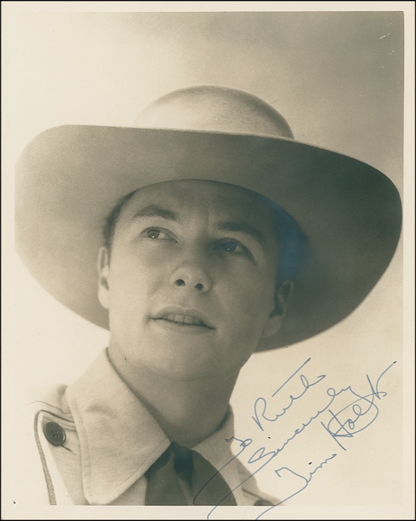 Vintage matte-finish 8 x 10 close-up photo of Holt in a cowboy hat, signed and inscribed in fountain pen, “To Ruth, Sincerely, Tim Holt.” The subtlest suggestion of silvering to dark portions and a few tiny flaws to negative in background, otherwise very fine, fresh condition. Beautifully signed and preserved! R&R COA.
