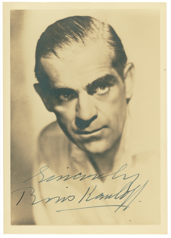 Vintage sepia matte-finish 5 x 7 photo, signed in fountain pen “Sincerely, Boris Karloff.” The subtlest suggestion of silvering to dark portions, otherwise very fine, fresh condition. A particularly fine example! PSA/DNA Auction LOA and R&R COA.