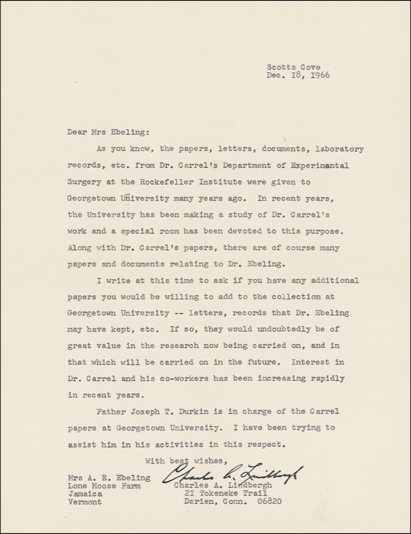 TLS signed “Charles A. Lindbergh,” one page, 8.5 x 11, December 18, 1966. Lindbergh writes to Mrs. A. E. Ebeling. In part: “As you know, the papers, letters, documents, laboratory records, etc. from Dr. Carrel’s Department of Experimental Surgery at the Rockefeller Institute were given to Georgetown University many years ago. In recent years, the University has been making a study of Dr. Carrel’s work and a special room has been devoted to this purpose. Along with Dr. Carrel’s papers, there are of course many papers and documents related to Dr. Ebeling. I write at this time to ask if you have any additional papers you would be willing to add to the collection at Georgetown University—letters, records that Dr. Ebeling may have kept, etc. If so, they would undoubtedly be of great value in the research now being carried on…. Interest in Dr. Carrel and his co-workers has been increasing rapidly in recent years….” Ebeling was the wife of A. E. Ebeling, a close associate of vascular researcher Alexis Carrel (1873–1944), recipient of the 1912 Nobel Prize in Medicine. In the 1930s, Lindbergh’s mechanical inclinations led to a collaboration with Carrel on a book titled The Culture of Organs, as well as on the development of a “perfusion pump” which allowed human organs to survive outside the body—a crucial advance in the development of organ transplants and open-heart surgery. Despite the acclaim lavished upon Lindbergh and Carrel, who appeared together on the cover of Time magazine in June 1938, their respective legacies were forever clouded by intertwined controversies. At a time when the Nazi regime was becoming ever more blatant in its aims, Carrel, a devoted eugenicist, vigorously promoted the notion of genetic “superiority” among an elite group of intellectuals, going so far as to advocate the use of gas chambers to rid humanity of “inferior” stock. During World War II, moreover, he was closely allied with a prominent collaborationist party in France and implemented a number of policies believed to have resulted in the execution of countless “defectives.” Carrel’s ties with Lindbergh only added fuel to the persistent, lifelong accusations of anti-Semitism against the flier, which would forever sully his image as an aviation hero. Accompanied by the original mailing envelope. Intersecting mailing folds (vertical fold to first name), otherwise very fine, fresh condition. R&R COA.
