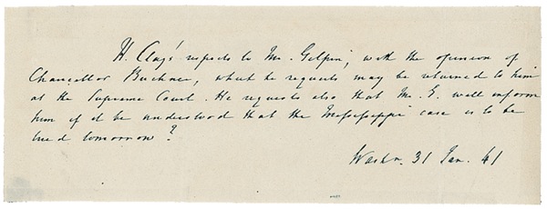 Distinguished statesman (1777–1852), longtime member of Congress, and three-time presidential candidate who became known as the “Great Compromiser” for his central role in the brokering of hot-button, slavery-related issues prior to the Civil War. Third-person ALS signed in the text “H. Clay,” 7.25 x 2.5, January 31, 1841. In full: “H. Clay’s respects to Mr. Gilpin; with the opinion of Chancellor Buckner, what he requests may be returned to him at the Supreme Court. He requests also that Mr. G. will inform him if it be understood that the Mississippi case is to be heard tomorrow?” Accompanied by a period portrait engraving. Faint intersecting folds and tape remnants to reverse, otherwise fine condition. R&R COA.