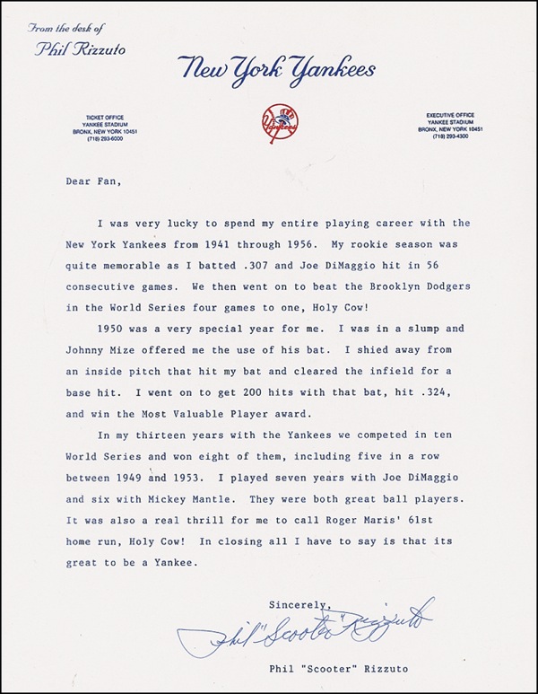 TLS signed “Phil ‘Scooter’ Rizzuto,” one page, 8.5 x 11, New York Yankees, From the Desk of Phil Rizzuto letterhead, no date. A synopsis of Rizzuto’s career. In part: “Dear Fan, I was very lucky to spend my entire playing career with the New York Yankees from 1941 to 1956. My rookie season was memorable as I batted .307 and Joe DiMaggio hit in 56 consecutive games. We then went on to beat the Brooklyn Dodgers in the World Series four games to one. Holy Cow! I played seven years with Joe DiMaggio and six with Mickey Mantle. They were both great ball players. It was also a real thrill for me to call Roger Maris’s 61st home run, Holy Cow!” In very fine condition. Auction LOA Steve Grad/PSA/DNA and R&R COA.