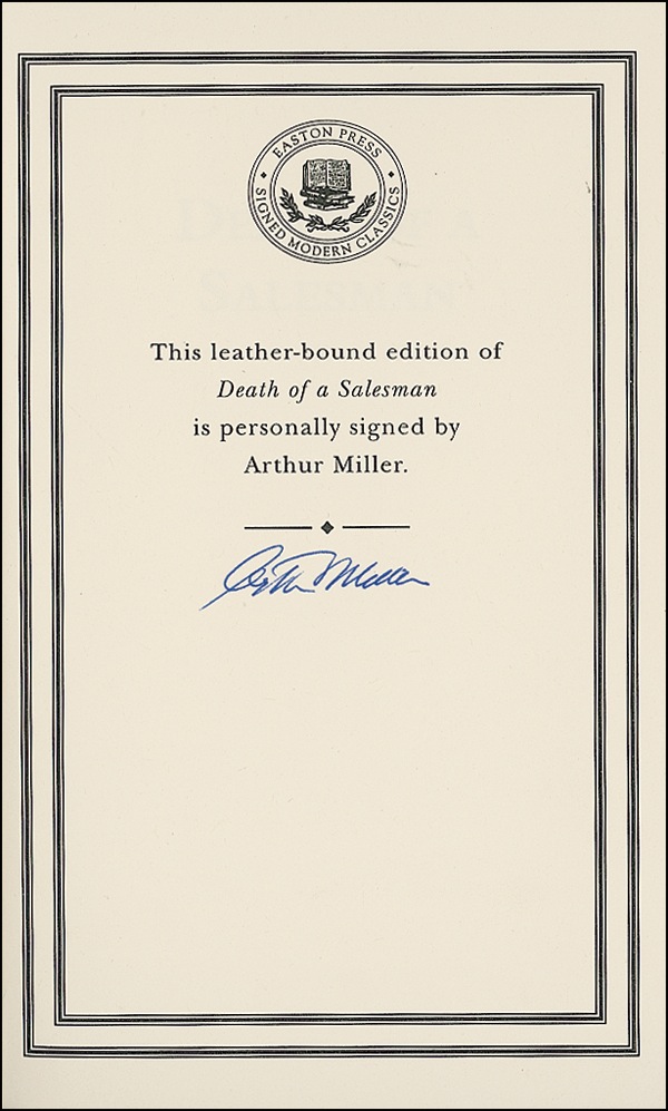 Signed book: Death of a Salesman. “Signed collector’s edition.” Norwalk: Easton Press, 1998. Leather-bound hardcover, 6 x 9, 112 pages. Signed in blue ink on a specially printed prefatory page. In very fine condition. R&R COA.