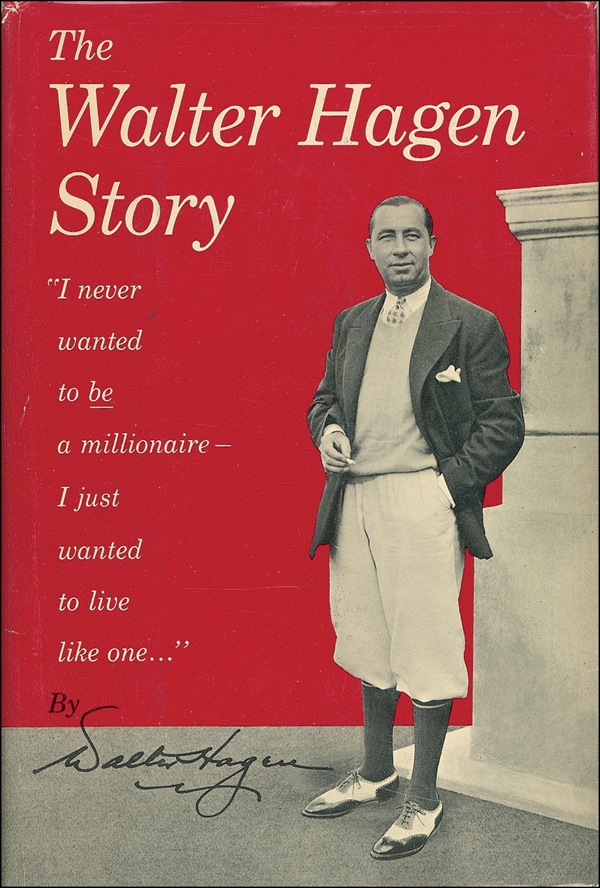 Signed book: The Walter Hagen Story. First edition, first printing. NY: Simon and Schuster, 1956. Hardcover, 6.25 x 9.25, 342 pages. “To a great pal, Sam Carvell, Golfingly, Walter Hagen, May 1956.” A touch of mild toning and edge wear to jacket, otherwise fine condition. Auction LOA Steve Grad/PSA/DNA and R&R COA.