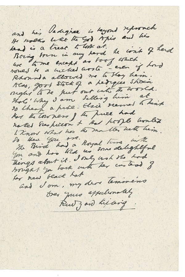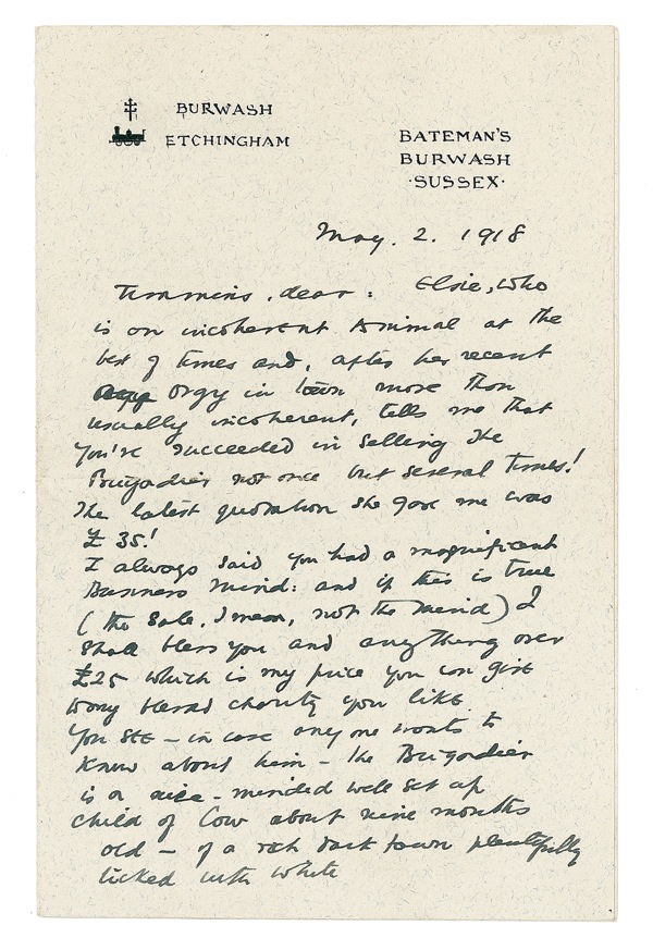 Nobel Prize–winning British author (1865–1936) best known for such colorful classics as Just So Stories, Captains Courageous, and The Jungle Book. ALS, two pages, 3.75 x 6, Bateman’s, Burwash, Sussex letterhead, May 2, 1918. Kipling writes to “Timmins.” In part: “Elsie [Kipling’s daughter], who is an incoherent animal at the best of times and, after her recent orgy in town more than usually incoherent, tells me that you’ve succeeded in selling the Brigadier [a cow owned by Kipling] not once but several times! The latest quotation she gave me was £35! I always said you had a magnificent business mind: and if this is true (the sale, I mean, not the mind) I shall bless you and anything over £25 which is my price you can give to any charity you like. You see—in case any one wants to know about him—the Brigadier is a nice-minded well set up child of Cow about nine months old … and his Pedigree is beyond reproach. He walks like the God Apis and his head is a treat to look at…. The Bird had a Royal time with you and has told us some delightful things about it. I only wish she had brought you back with her instead of her new black hat….” In very fine, clean condition. Auction LOA John Reznikoff/PSA/DNA and R&R COA.