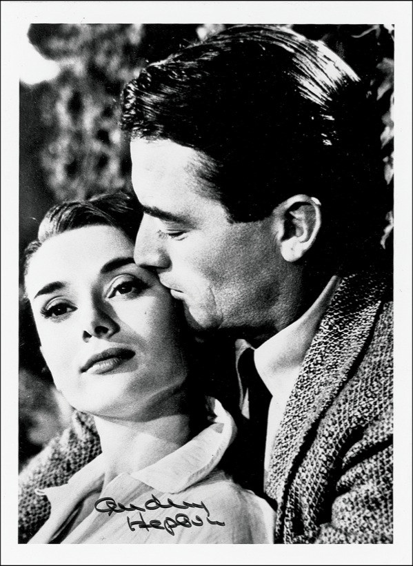 Glossy 7 x 9.25 photo of Hepburn with Gregory Peck in her Oscar-winning role in Roman Holiday, signed in black felt tip “Audrey Hepburn.” A few small, unobtrusive bends, otherwise fine condition. R&R COA.