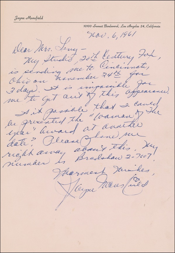ALS, one page, 7.25 x 10.5, peach personal letterhead, November 6, 1961. Mansfield writes to Mrs. Levy. In full: “My studio, 20th Century Fox, is sending me to Cincinnati, Ohio on November 24th for 3 days. It is impossible for me to get out of this appearance. Is it possible that I could be presented the ‘Woman of the Year’ award at another date? Please phone me right away about this. My number is Bradshaw 2–7007. Warmest wishes….” A hint of very subtle soiling and handling wear, otherwise fine, fresh condition. PSA/DNA Auction LOA and R&R COA.