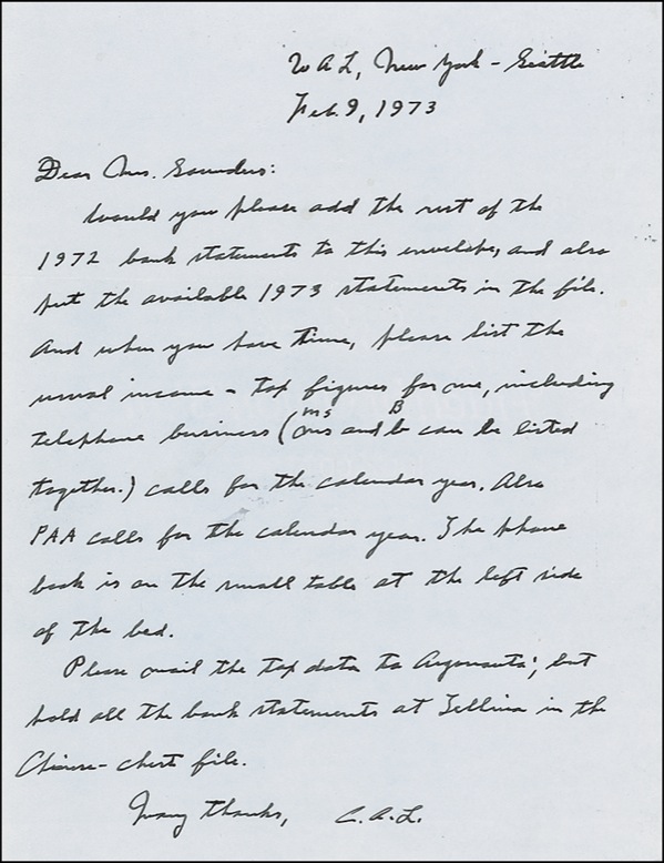 ALS signed “C. A. L.,” one page on onionskin, 8.5 x 11, February 9, 1973. Lindbergh writes from “U A L New York—Seattle” to his secretary, Jean Saunders. In part: “Would you please add the rest of the 1972 bank statements to this envelope, and also put the available 1973 statements in the file. And when you have time, please list the usual income-tax figures for me, including telephone business…. Also PAA calls for the calendar year. The phone book is on the small table at the left side of the bed….” Intersecting mailing folds, and staple hole lightly touching header, otherwise fine condition. R&R COA.