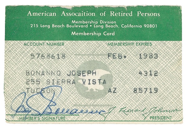 Mobster (1905–2002) who became boss of one of the most prominent crime families in the world. Bonanno’s printed membership card from the American Assocaition [sic] of Retired Persons with an expiration date of February 1983, signed on the front in ballpoint. Accompanied by a certificate of authenticity signed by Bonanno’s daughter-in-law, Rosalie Bonanno. Light edge wear and subtle haloing of ink, otherwise fine condition. R&R COA.