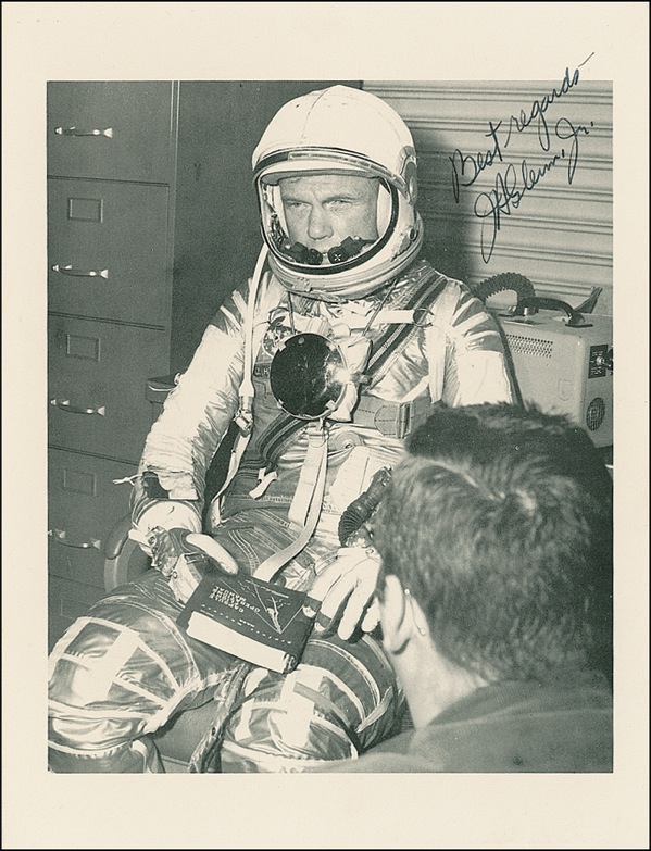 Vintage 8 x 10.5 paperstock photo of Glenn before his flight with a copy of the capsule flight operations manual on his lap, signed in fountain pen, “Best regards, J. H. Glenn, Jr.” Small staple hole to top border, otherwise very fine condition. COA Scott Cornish and R&R COA.