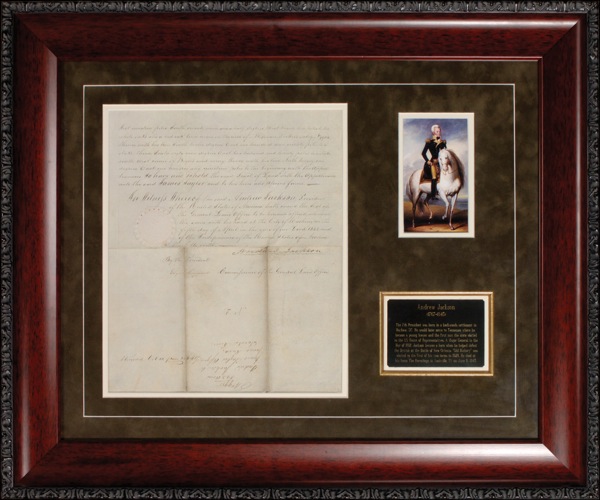 Manuscript DS as president, one page both sides on vellum, 12 x 14.5, April 5, 1832. A grant for a parcel of land issued to James Taylor. Handsomely matted and framed with a biographical plaque and color image to an overall size of 30.5 x 26. In very good condition, with heavy intersecting folds (lightly touching tops of initials; vertical fold to “e”) and one extra crease, scattered soiling (mainly along folds; touching second half of first name), and subtly irregular ink adhesion. The embossed seal remains intact at center left. Auction LOA John Reznikoff/PSA/DNA and R&R COA. Oversized.