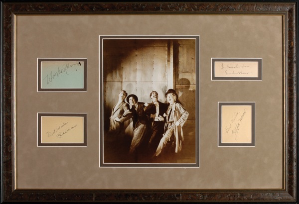 Vintage fountain pen signatures, “Best wishes from Groucho Marx,” “Best wishes, Zeppo Marx,” “Best wishes Chico Marx,” and “Harpo Marx,” on a various colored individual album pages. All four are archivally double suede matted and framed with a photo of the four brothers, to an overall size of 25.25 x 17.25. In fine condition, with a bit of mild toning and an ink spot to Harpo’s page. PSA/DNA Auction LOA and R&R COA. Oversized.