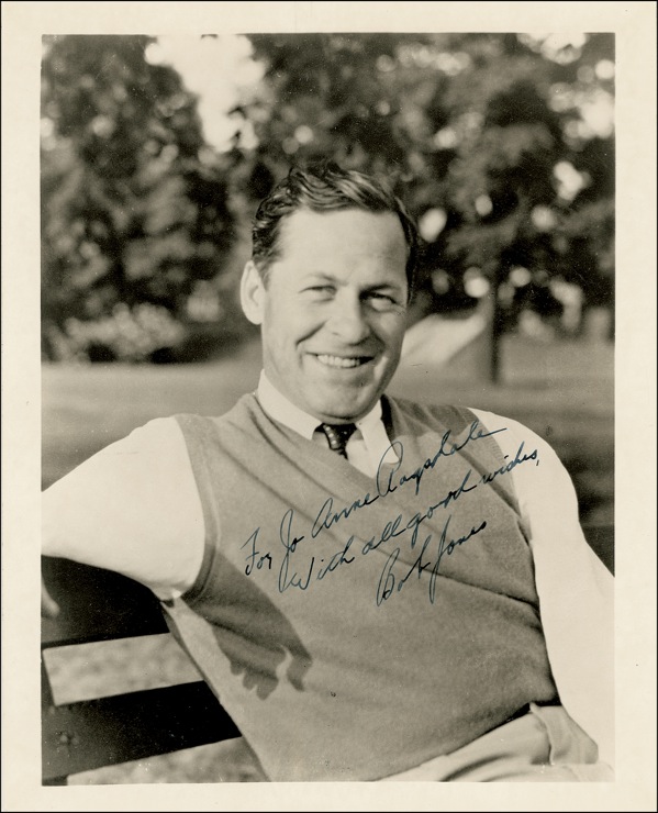 Golfer (1902–1971) who, in 1930, became the only Grand Slam winner in the sport’s history, taking the U.S. and British Open and U.S. and Britain Amateur titles. Over the course of his career, he would win a total of four U.S. Open titles, five U.S. Amateur titles, and three British Open titles. Wonderful vintage matte-finish 8 x 10 photo of Jones sitting on a bench on the Augusta National Golf Course, signed and inscribed in fountain pen “For Jo Anne Ragsdale, With all good wishes, Bob Jones.” In fine condition, with a small vertical crease at bottom and a paperclip impression along top edge. Auction LOA Steve Grad/PSA/DNA and R&R COA.
