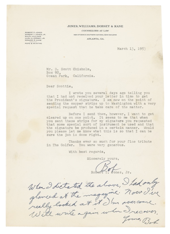 Golfer (1902–1971) who, in 1930, became the only Grand Slam winner in the sport’s history, taking the U.S. and British Open and U.S. and British Amateur titles. Over the course of his career, he would win a total of four U.S. Open titles, five U.S. Amateur titles, and three British Open titles. TLS, twice signed “Bob,” one page, 7.75 x 11, Jones, Williams, Dorsey & Kane law firm letterhead, March 13, 1953. Jones writes to D. Scott Chisholm, a golf journalist. In full: “I wrote you several days ago telling you that I had not received your letter in time to get the President’s signature. I am now on the point of sending the copper strips up to Washington with a very special request that he take care of the matter. Before I send them, however, I want to get cleared up on one point. It seems to me that when you sent these strips for my signature you requested that some special sort of instrument be used and that the signature be produced in a certain manner. Would you please let me know what this is so that I can be sure the job is done right. Thanks ever so much for your fine tribute in The Golfer. You were very generous….” After signing, Jones adds a handwritten postscript, which he signs “Bob”: “When I dictated the above, I had only glanced at the magazine. Now I’ve really looked at it [and] I’m overcome. Will write again when I recover.” In very good condition, with mild wrinkling and handling wear, a few faint marginal stains, trimmed right edge, and a diagonal creases across the top portion of the letter. Auction LOA Steve Grad/PSA/DNA and R&R COA.