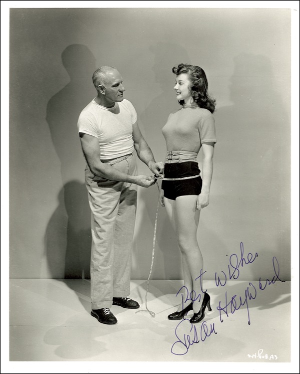 Much-adored American actress (1917–1975) who won the Academy Award for Best Actress for her penetrating, multidimensional portrayal of death-row inmate Barbara Graham in the 1958 classic I Want to Live! Wonderful vintage glossy 8 x 10 photo of the shapely Hayward having her hips measured by a trainer, boldly signed in purple fountain pen, “Best wishes, Susan Hayward.” A few scattered minor surface marks and impressions, otherwise fine condition. PSA/DNA Auction LOA and R&R COA.
