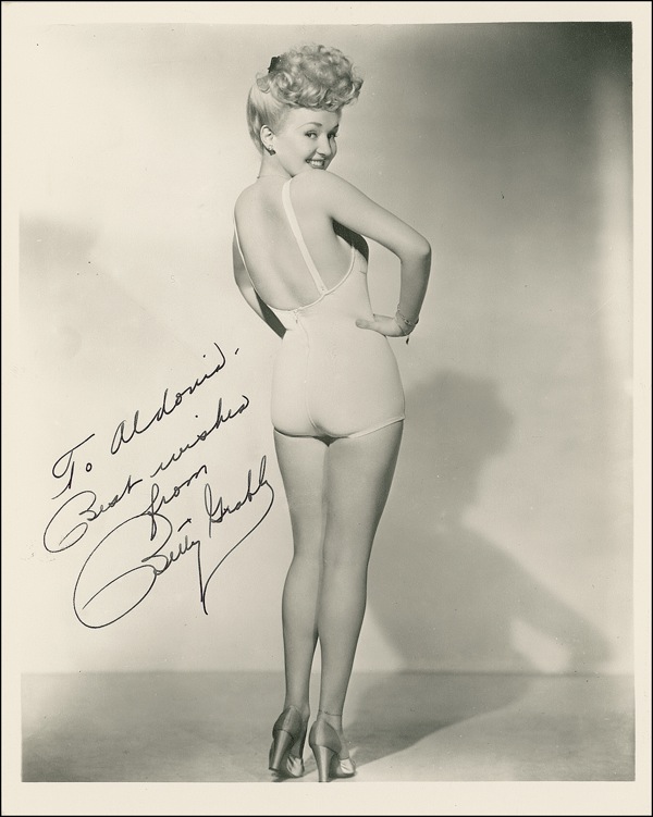 Vintage matte-finish 8 x 10 photo of the leggy Grable in her iconic over-the-shoulder pose, signed and inscribed in fountain pen, “To Aldonia, Best wishes from Betty Grable.” Nearly imperceptible bend to one corner, otherwise very fine condition. A landmark of cheesecake photography! R&R COA.