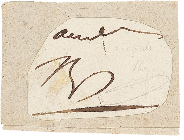 Ink signature, “Np,” on an irregularly trimmed off-white 2 x 1.5 slip affixed to a larger slip. In very good condition, with mounting as noted, close trimming, and a few faint creases and stains touching signature. The writing is quite bold and dark. R&R COA.