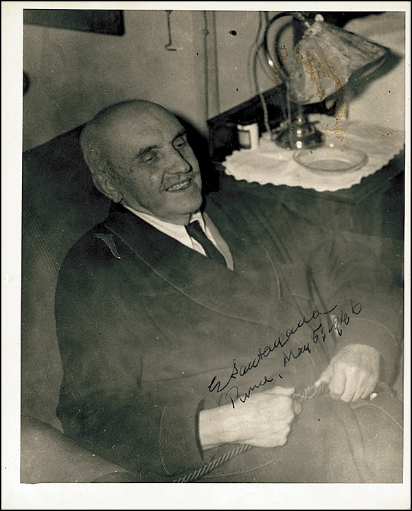 Spanish–born philosopher and author (1863–1952) who made significant contributions to the study of aesthetics, literary criticism, and modern speculative philosophy. His best-known work is The Life of Reason, in which he asserts that reason is a union of impulse and ideas. Vintage glossy 8 x 10 photo, signed in fountain pen “G. Santayana, Rome, May 5, 1946.” In good condition, with allover spotting and a few cracks to emulsion, scattered dings and impressions, and glue remnant at upper right. R&R COA.