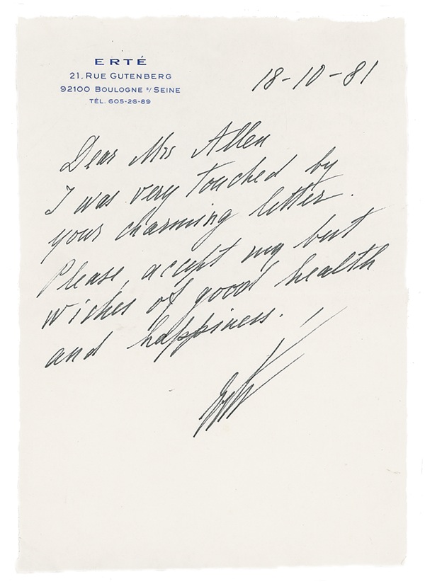 Russian-born French artist and designer (1892–1990) who was one of the leading figures of the Art Deco movement. ALS, one page, 5.75 x 8, deckle-edged personal letterhead, October 18, 1981. The artist writes to Mrs. Allen. In full: “I was very touched by your charming letter. Please accept my best wishes of good health and happiness.” Accompanied by the original mailing envelope. A few mild wrinkles, otherwise fine condition. R&R COA.