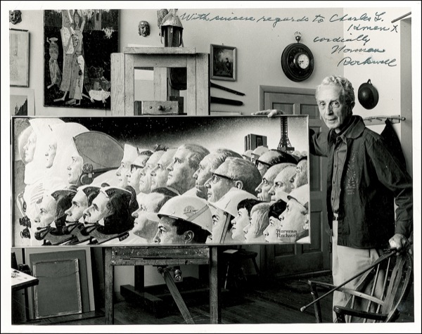 Satin-finish 10 x 8 photo of Rockwell posing in his studio with a space-related painting, signed and inscribed in black felt tip, “With sincere regards to Charles L. K—, Cordially, Norman Rockwell.” A few corner creases, surface marks, and tiny edge tears, mild rippling to bottom edge, and light brush to last name, otherwise fine condition. R&R COA.
