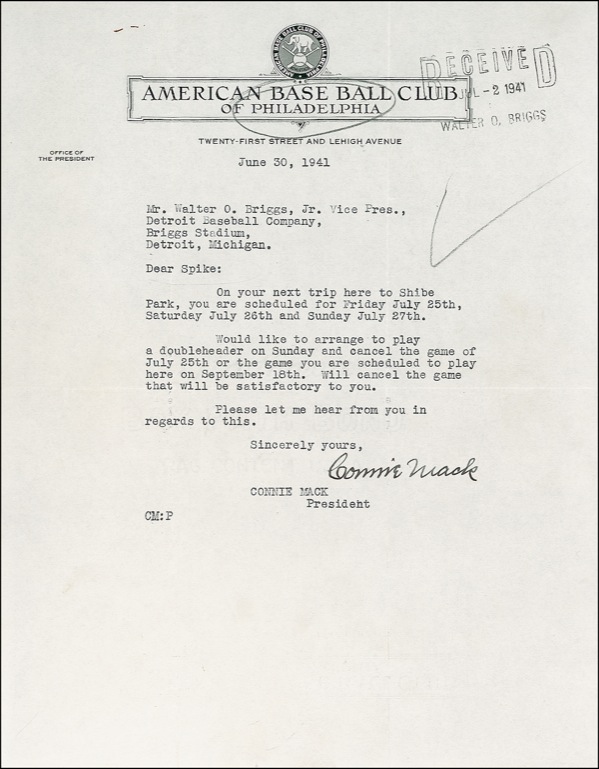 Once a catcher, but made his mark as a manager. After a stint at the helm of Pittsburgh, he assumed control of the Philadelphia Athletics in 1901 and continued for 50 years until retirement at the age of 88. Mack is best remembered as a dignified, scorecard-waving leader in a business suit, who won five World Series crowns and built two dynasties. TLS, one page, 8.5 x 11, American baseball Club of Philadelphia letterhead, June 30, 1941. Letter to Walter Briggs, Jr., Vice President of the Detroit Tigers concerning an upcoming series. In part, “Would like to arrange to play a doubleheader on Sunday and cancel the game of July 25th or the game you are scheduled to play here on September 18th. Will cancel the game that is satisfactory to you.” In fine condition, with intersecting folds, one through a single letter of signature, a couple pencil notations and an office stamp to top right. Auction LOA Steve Grad/PSA/DNA and R&R COA.