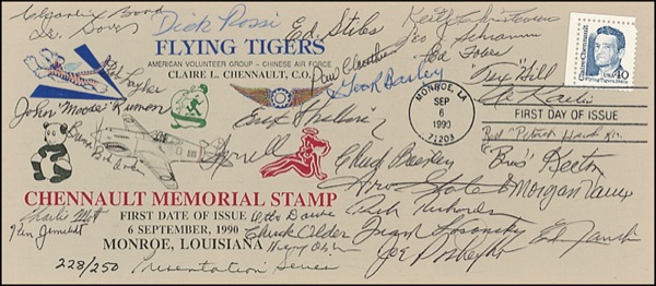 Limited edition FDC, 9.5 x 4.25, #228/250, with a cachet honoring the Chennault Memorial Stamp, signed in various inks by more than 20 Flying Tigers, including Hill, Jernstedt, Rossi, Older, Clouthier, Christensen, Shilling, Losonsky, Poshefko, Richardson, Mott, Layher, Bond, Schramm, Baisden, Stiles, Petach, Schramm, Fobes, Kaelin, Keeton, Vaux, and Daube. In fine condition. R&R COA.