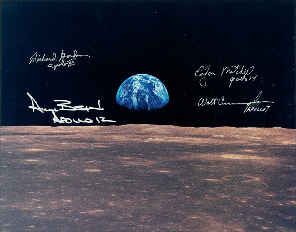 Color satin-finish 14 x 11 photo of the Earth rise taken from lunar orbit, signed in silver ink by Apollo astronauts Richard Gordon, Edgar Mitchell, Alan Bean, and Walt Cunningham, each adding their missions under their signatures. In very fine condition. COA Scott Cornish and R&R COA.