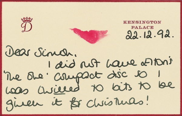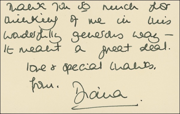 Lady Diana Frances Spencer (1961–1997) was 20 when she married Prince Charles, future king of England, on July 29, 1981. While her youth and beauty made her a favorite of the public and the paparazzi, her personal life provided an endless supply of fodder for the tabloids. After the birth of two sons, Princes William and Harry, Diana and Charles finally divorced in 1996. Diana devoted her post-royal life to her sons and worldwide charities. She and her boyfriend, department-store heir and sometime movie producer Dodi Fayed, were killed in a 1997 car crash in Paris while on the run from paparazzi. ALS, one page both sides, 6.25 x 4, embossed Kensington Palace letterhead, December 22, 1992. Letter of thanks to Simon for a Christmas gift. In full, “I did not have Elton’s ‘The One’ compact disc so I was thrilled to bits to be given it for Christmas! Thank you so much for thinking of me in this wonderfully generous way - It meant a great deal. Love & special thanks from Diana” Accompanied by the original mailing envelope addressed in Diana’s hand. Diana has also placed a red lipstick lip impression on the front of the card. In very fine condition. Auction LOA John Reznikoff/PSA/DNA and R&R COA.