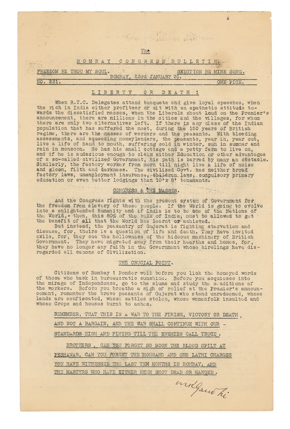 “Freedom Be Thou My Soul; Sedition Be Mine Song”: Gandhi signs an inflammatory 1931 newsletter promoting Indian independence