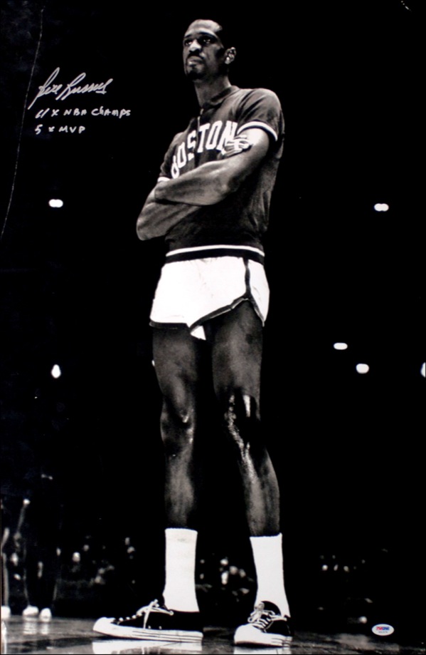 Scarce satin-finish 20 x 30 imposing full-length photo of Russell before a Celtics game, signed in silver ink, “Bill Russell, 11x NBA Champs, 5x MVP.” Accompanied by a certificate of authenticity from PSA/DNA. Rolled and in very fine condition, with a PSA/DNA authentication label affixed to lower right. Auction LOA Steve Grad/PSA/DNA and R&R COA.