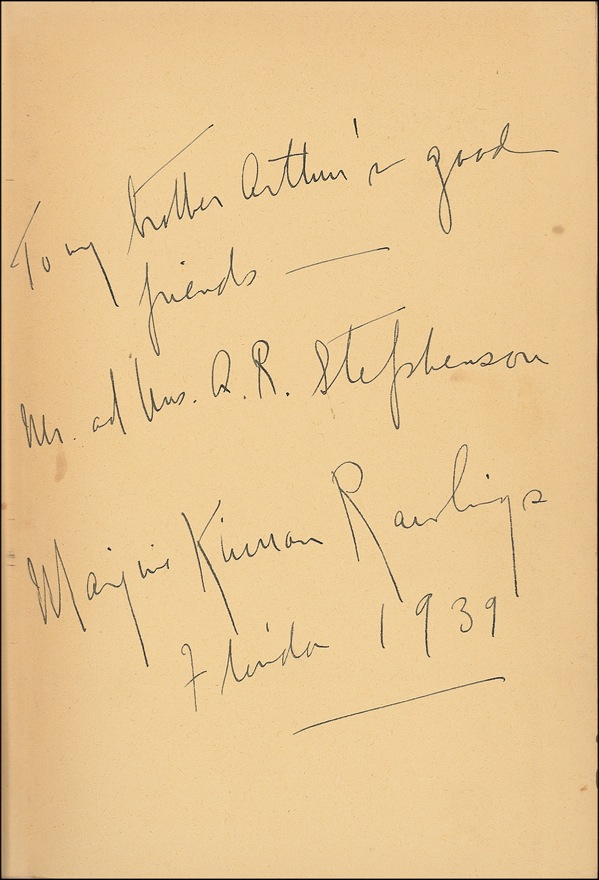 Pulitzer Prize–winning American writer (1896–1953) best known for her Florida-set classics The Yearling and Cross Creek. Signed book: The Yearling. First edition, first printing (with “A” to copyright page). NY: Charles Scribner’s Sons, 1938. Hardcover, 6 x 8.25, 428 pages. Signed and inscribed in ink on the front free end page, “To my brother Arthur’s good friends—Mr. and Mrs. A. R. Stephenson, Marjorie Kinnan Rawlings, Florida 1939.” A touch of light staining to front joint of cover, scattered light toning to interior (lightly touching a few letters of signature and inscription), otherwise a fine, tight copy. R&R COA.