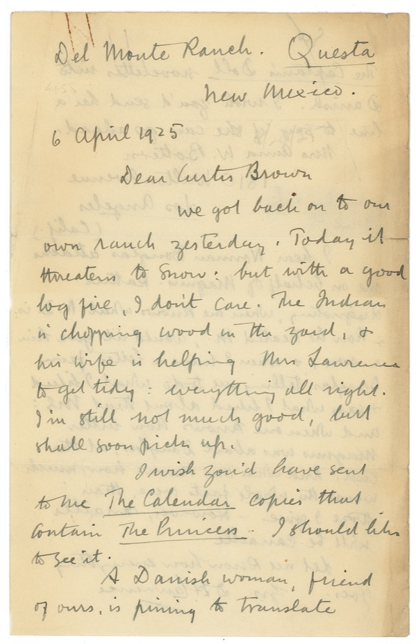 English novelist, author of Lady Chatterley’s Lover, Women in Love, etc. ALS, one page both sides, 5.5 x 8.5, April 6, 1925. Lawrence writes to Curtis Brown from his ranch in New Mexico. In part, “Today it threatens to snow; but with a good log fire, I don’t care. The Indian is chopping wood in the yard, & his wife is helping Mrs. Lawrence get tidy…I wish you’d have sent to me The Calendar copies that contain The Princess. I should like to see it. A Danish woman, friend of ours, is pining to translate The Captain’s Doll novelettes into Danish. I wish you’d send her a line to say if she can go ahead…I hear Norman Douglas attacks me on behalf of [Maurice] Magnus. Rather disgusting. When one knows what N. D. is & how he treated M., would it give him a son; & when I have a letter from Douglas telling me to do what I liked & say what I liked about that MS; and when one knows how bitter Magnus was about Douglas, at the end. And when one knows how much worse the whole facts were, than those I give. - However canaille will be canaille.” Norman Douglas was a British writer, now best known for his 1917 novel South Wind. From 1912 to1914 Douglas worked for The English Review and met Lawrence through this connection. This led to a feud between the two, after Lawrence in 1922 portrayed James Argyle in Aaron’s Rod, a character that he based a character on Douglas. Lawrence met Maurice Magnus in Florence in late 1919 through Douglas, for whom Magnus was a kind of secretary and errand boy. Magnus turned to Lawrence for entertainment, pocket money, literary advice, and shelter. In mid-1920, friendless and with the police closing in on him, Magnus fled to Malta, where, alone in a rented room, he poisoned himself. Lawrence would go on to write Memoir of Maurice Magnus, considered one of his finest pieces of writing. Accompanied by a certificate of authenticity from PASS-CO. Narrow strip of edge toning, a couple rusty paperclip marks, and some scattered creasing, otherwise fine condition. Auction LOA John Reznikoff/PSA/DNA and R&R COA.