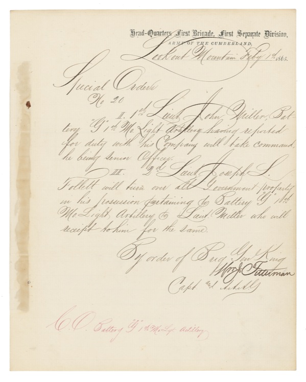 American military officer (circa 1833–1866). After serving with distinction in the Civil War, Fetterman became captain of a battalion stationed at Fort Phil Kearny, Wyoming, for the protection of miners and settlers traveling along the Bozeman Trail. On December 21, 1866, a band led by Crazy Horse’s uncle, Hump (a.k.a. High Back Bone), attacked a nearby train. Though a newcomer to the region and to confrontations with Indians, Fetterman volunteered to lead a relief party of several dozen men, later joined by another military detachment and two civilians. Ignoring orders to go no further than Lodge Trail Ridge, Fetterman led his men in pursuit of several Lakota Sioux, Northern Cheyenne, and Arapaho decoys, headed by Crazy Horse, who led the troops into an ambush by a force of hundreds. Though Fetterman had once boasted he could “ride through the Sioux Nation” with no more than 80 soldiers, he and the troops under his command were wiped out in less than an hour in what came to be known as the Fetterman Massacre, and, to the three Indian nations involved, the Battle of Kills 100, 100 Hundred Soldiers Killed Fight, and 100 Hundred in the Hands. Scarce war-dated DS, signed “Wm. J. Fetterman,” one faintly lined page, 7.75 x 9.75, Headquarters, First Brigade, First Separate Division, Army of the Cumberland letterhead, February 1, 1865. Special Orders No. 20. In part: “I. 1st Lieut. John Miller ... having reported for duty with his Company will take command, he being Senior Officer. II. 2d Lieut. Joseph L. Follett will turn over all Government property in his possession pertaining to Battery ‘G’ 1st Mo. Light Artillery to Lieut. Miller who will receipt to him for the same. By order of Brig. Gen. King....” Two small holes and light staining from previous binding to left margin, and a touch of very mild handling wear, otherwise fine, clean condition. Autograph material from Fetterman is quite uncommon. Auction LOA John Reznikoff/PSA/DNA and R&R COA.