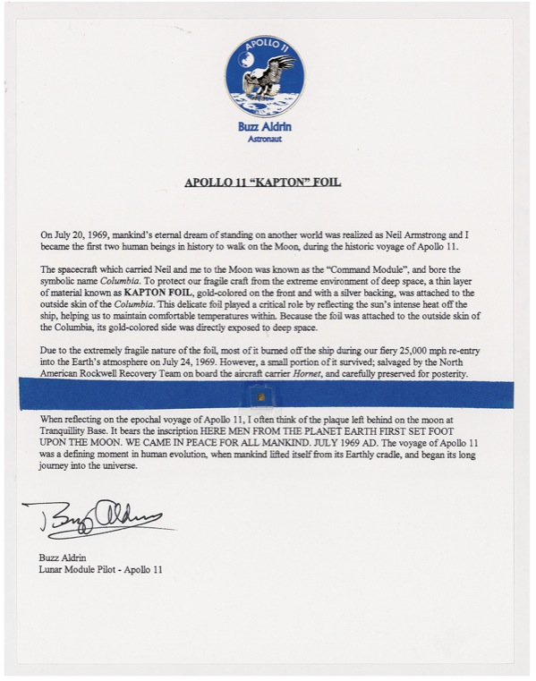 DS, one page, 8.5 x 11, Apollo 11 Buzz Aldrin letterhead, no date. A tiny flown piece of gold “Kapton” foil from the Apollo 11 Columbia Command Module, contained in a small pouch affixed to an 8.5 x 11 informational sheet describing the nature and purpose of the material, signed at the conclusion, “Buzz Aldrin.” Also included is another, larger piece of the foil, of somewhat irregular rectangular shape and measuring approximately 2.5 x 1.25, together with a copy of a certificate signed by Robert E. Miner of the North American Rockwell Apollo Launch Team. In part: “This is to certify that this swatch of gold foil was recovered from the Columbia Command Module by Ozzie Reid, North American Rockwell Recovery Team, aboard the U.S.S. Hornet and presented to me.” In fine condition. Kapton foil remnants of this larger size are quite uncommon. R&R COA.