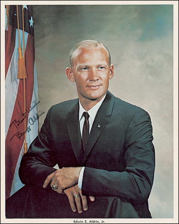 Vintage color 8 x 10 NASA photo of Aldrin in his civilian clothes, signed in black felt tip, “Best wishes, Buzz Aldrin.” In very fine condition. COA Scott Cornish and R&R COA.