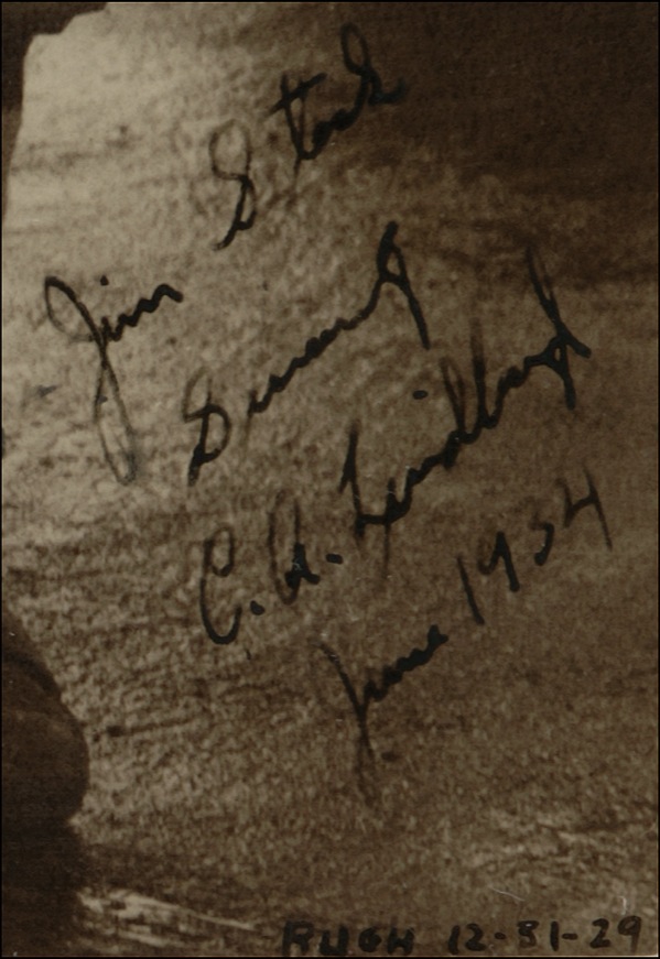 Fantastic crystal-clear vintage matte-finish 8 x 10 photo of Charles and Anne Lindbergh, both clad in fur-lined flight suits, posing in front of their plane, signed and inscribed in fountain pen “To Jim Steck, Sincerely, C. A. Lindbergh, June 1934.” Apparent photographer’s notation at bottom edge reads, “Rugh 12-31-29.” Matted and framed to an overall size of 12 x 14.5. In fine condition. Auction LOA John Reznikoff/PSA/DNA and R&R COA.