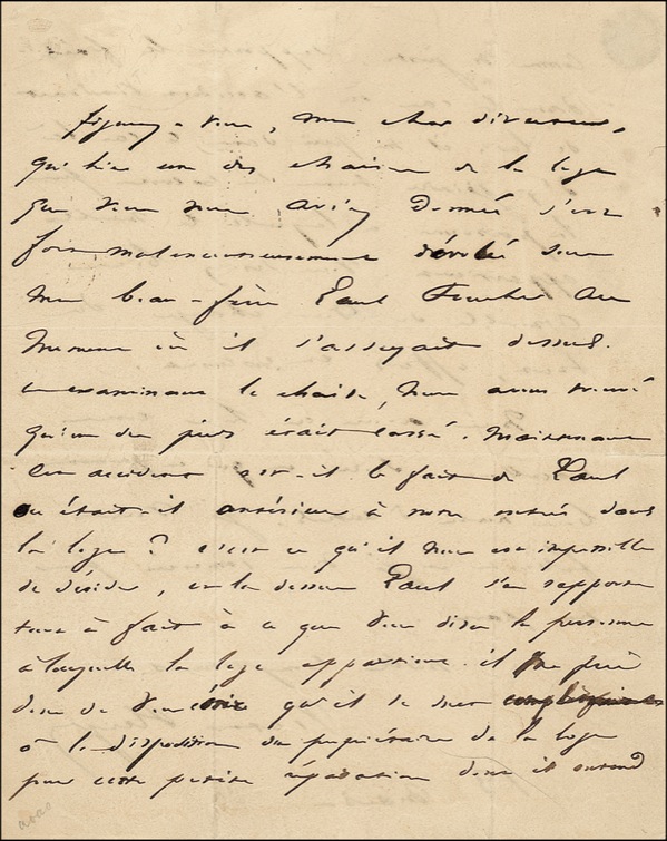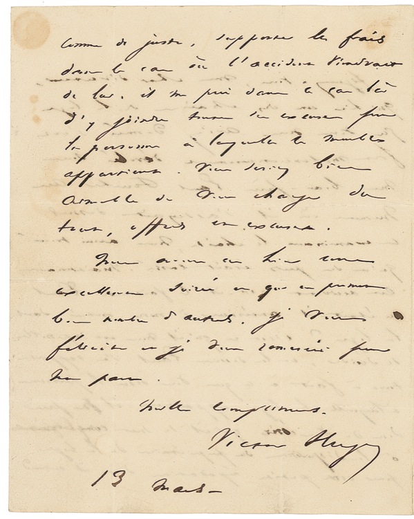 ALS in French, one page both sides, 6.25 x 7.75, March 13, 1837. Boldly penned letter to Mr. Duponchet, Director of the Opera. Hugo relates the embarrassment of an unfortunate accident which happened to his brother in law at the opera last night. In part, “Just imagine, yesterday one of the seats in the loge which you kindly had given us unfortunately gave way the very moment my brother in law, Paul, was about to sit down. Upon examining the seat, we discovered one of the legs was broken. The question now is, was this condition one that existed prior to Paul’s entrance into the loge. This is something, we cannot decide. And Paul will abide by whatever the owner of the loge decides. Paul has asked me to write you to let you know that he will be completely at the disposal of the owner of the loge for this small repair and for which he is ready if he judges Paul to be the cause of the accident.” Second integral page bears an address panel in Hugo’s hand, as well as a postmark of march 13, 1837. Intersecting mailing folds, one affecting last letter in first name of signature, a bit of light toning, and mounting remnants to second page, otherwise fine condition. R&R COA.