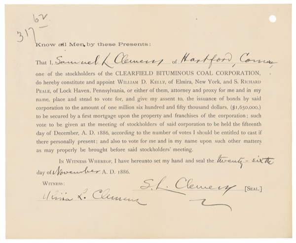 Taking stock: Clemens signs a stockholders’ proxy a year after the publication of Huckleberry Finn