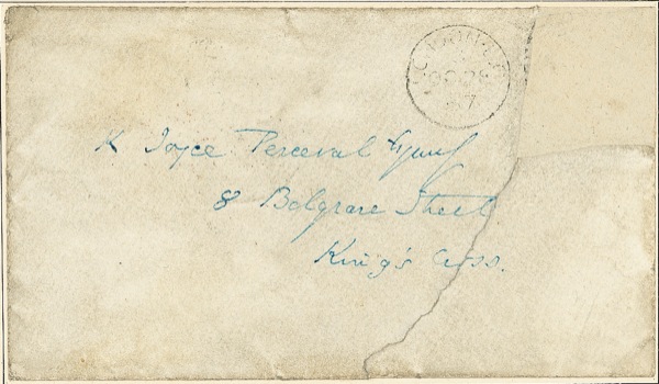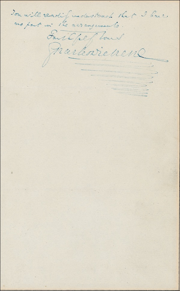 ALS, two pages, 4.25 x 7, Gad’s Hill Place letterhead, October 27, 1867. Dickens writes to K. Joyce Percival in Belgrave Street, King’s Cross. In full: “I beg to acknowledge the receipt of your obliging letter, and to thank you for your acceptable expressions of goodwill. The short interval between this time and my going to Liverpool, is already devoted to so many engagements in so many places, that I am powerless to make any new appointment; but I am not the less sensible of the interest you express in my proceedings. Referring to that part of your letter which informs me of Mr. Manockjie C—’s intention to honour the dinner that is to be given to me on Saturday with his presence, I may add that I mentioned his wish to beg a ticket and secure a good place, to the Honorary Secretary. You will readily understand that I have no part in the arrangements….” Accompanied by the original mailing envelope addressed in Dickens’s hand. Both the second page of the letter and the envelope have been expertly inlaid to larger sheets. Mild wrinkling, soiling, and handling wear, otherwise fine condition. R&R COA.