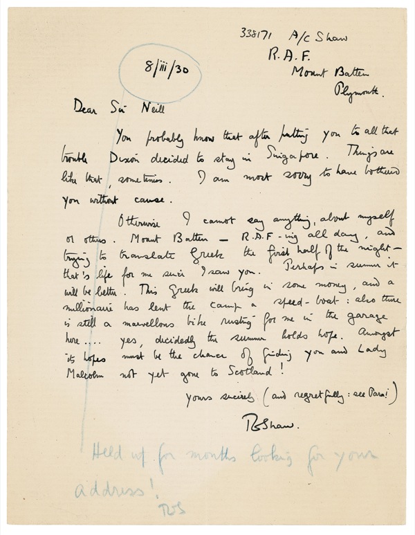 British archaeologist, soldier, adventurer, and writer (1888–1935) immortalized in the epic 1962 screen biography Lawrence of Arabia. He attained international renown for his role as British liaison in the Arab Revolt of 1916–1918, which he recounted in his best-selling memoir Seven Pillars of Wisdom. He joined Royal Tank Corps in 1923 under name of T. E. Shaw (an assumed name he used during a short period of time in his military career), transferred to the RAF in 1925. He was discharged in 1935 and was killed shortly after in a motorcycling accident. ALS signed “T. E. Shaw,” one page, 6.75 x 9, March 8, 1930. Lawrence of Arabia (using his Air Force alias “Shaw” for anonymity) pens a gorgeous full one-page ALS with prophetic content. In full: “You probably know that after putting you to all that trouble Dixon decided to stay in Singapore. Things are like that, sometimes. I am most sorry to have bothered you without cause. Otherwise I cannot say anything, about myself or others. Mount Batten–R.A.F.-ing all day and trying to translate Greek the first half of the night–that’s life for me since I saw you. Perhaps in summer it will be better. This Greek will bring in some money, and a millionaire has lent the camp a speed boat: also there is still a marvellous bike rusting for me in the garage here… yes, decidedly the summer holds hope. Amongst its hopes must be the chance of finding you and Lady Malcolm not yet gone to Scotland! Yours sincerely (and regretfully: see Para 1) T.E. Shaw.” Then in blue pencil, the date of the letter is circled, and this footnote is added: “Held up for months looking for your address! TES.” In fine condition, with a couple of very light bends. Auction LOA John Reznikoff/PSA/DNA and R&R COA.