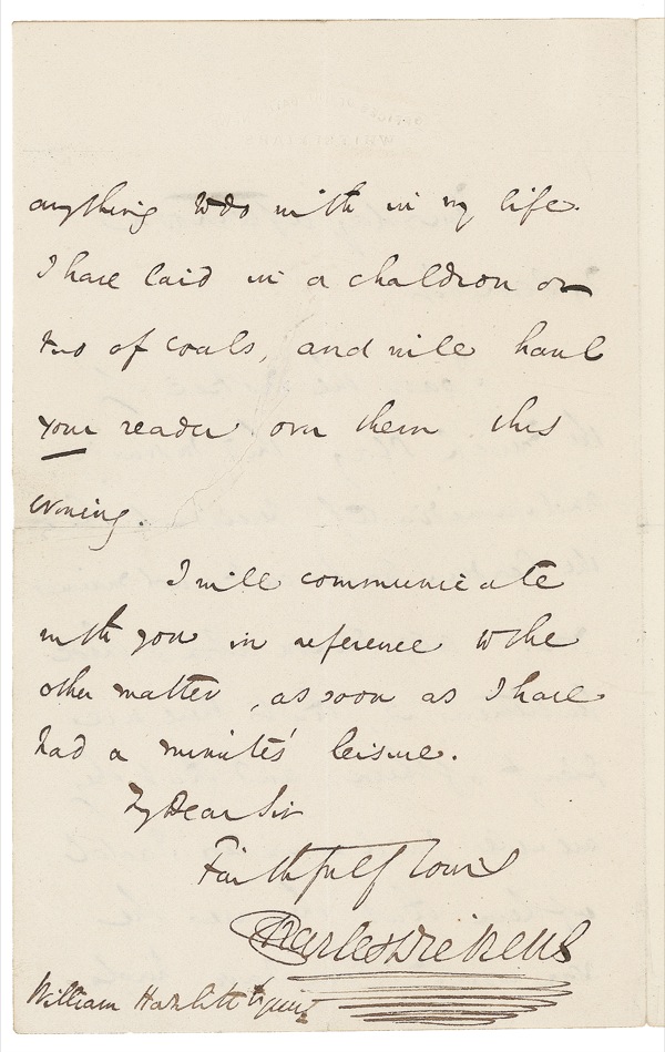 Charles Dickens: Dickens violently defends his drama critic: “I have laid in a chaldron or two of coals and will haul your reader over them this morning.”