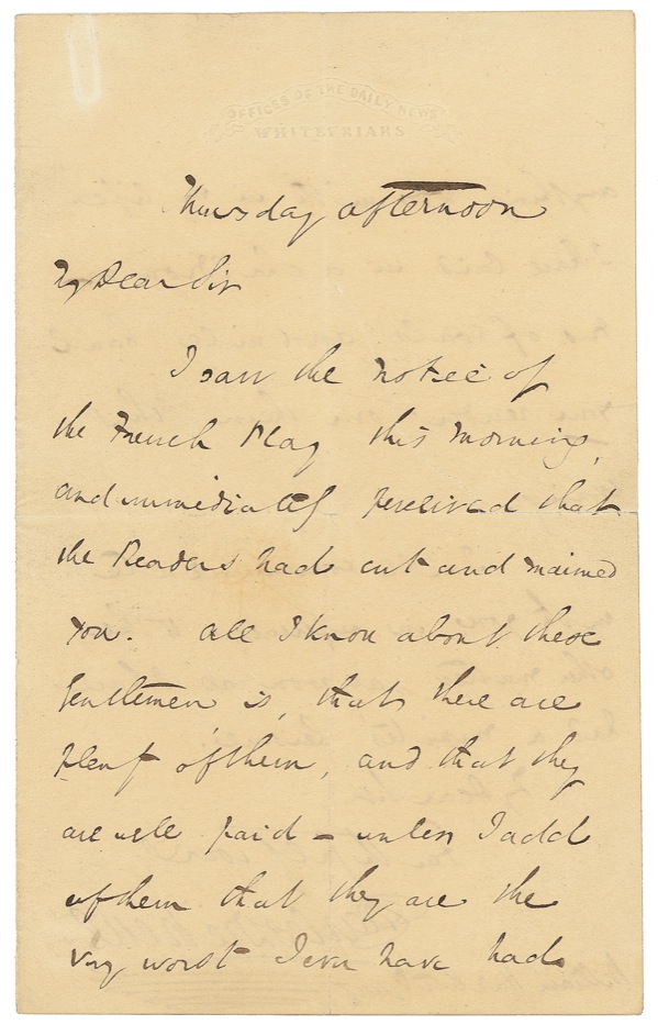 English novelist and the author of such classics as Oliver Twist, A Tale of Two Cities, and David Copperfield. ALS, one page both sides, 4.5 x 7.25, Offices of the Daily News letterhead, no date. Letter to famous essayist William Hazlitt. At the time of writing, Dickens was the editor of the London Daily News, and Hazlitt was the drama critic. In part, “I saw the notice of the French Play this morning and immediately perceived that the Readers had cut and maimed you. All I know about these gentlemen is, that there are plenty of them, and that they are well paid - unless I add of them that they are the very worst I ever have had anything to do with in my life. I have laid in a chaldron or two of coals and will haul your reader over them this morning.” Intersecting folds, paperclip impression along top edge, and an even shade of toning to front page, otherwise fine condition. Auction LOA John Reznikoff/PSA/DNA and R&R COA.