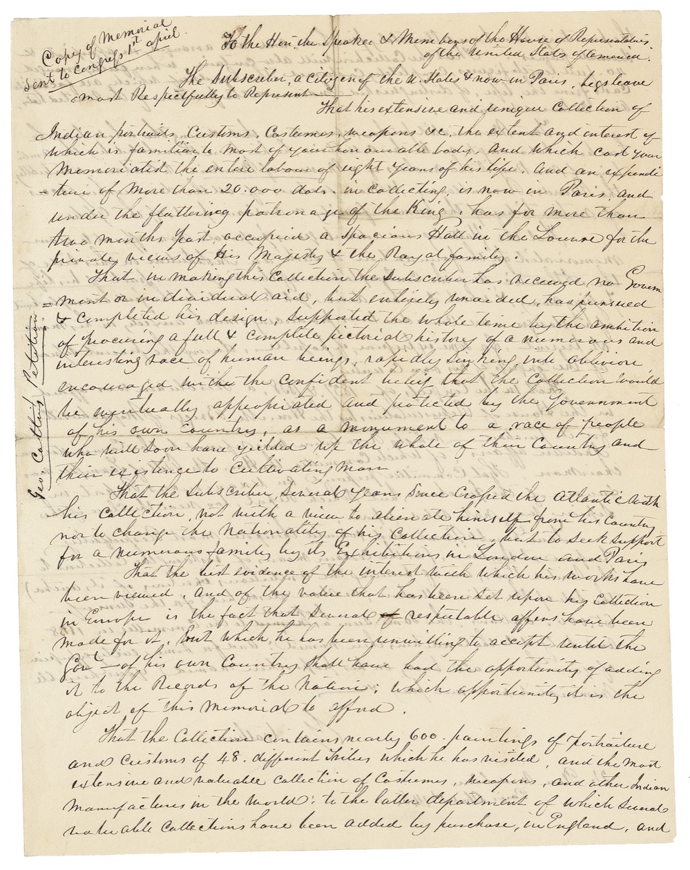 American artist, author, and traveler (1796–1872) best known for his Indian Gallery, a monumental collection of paintings documenting the quickly vanishing customs, costumes, and cultures of various Native American peoples in their natural environment. Produced by Catlin in the 1830s over the course of five westward journeys to observe his subjects firsthand, the Indian Gallery represents a towering achievement in both American art and ethnography of the 19th century. Superb and exceedingly important ALS signed “Geo. Catlin,” one page both sides, 8.25 x 10.5, April 1, 1846. A retained “Copy of Memorial [memorandum] sent to Congress 1st April,” addressed to “Hon. the Speaker & Members of the House of Representatives.” In part [boldface added]: “The Subscriber a citizen of the U. States & now in Paris, begs leave most respectfully to represent: That his extensive and unique collection of Indian portraits, customs, costumes, weapons &c, the extent and interest of which is familiar to most of your honourable body, and which cost your memorialist the entire labour of eight years of his life, and an expenditure of more than 20,000 dols. in collecting, is now in Paris, and under the flattering patronage of the King has for more than two months past occupied a spacious Hall in the Louvre for the private views of His Majesty & the Royal Family. That in making this collection the subscriber has received no government or individual aid, but entirely unaided, has pursued & completed his design, supported the whole time by the ambition of procuring a full & complete pictorial history of a numerous and interesting race of human beings rapidly sinking into oblivion, encouraged with the confident belief that the collection would be eventually appropriated and protected by the government of his own country, as a monument to a race of people who will soon have yielded up the whole of their country and their existence to the cultivating mass. That the subscriber several years since crossed the Atlantic with his collection, not with a view to alienate himself from his country nor to change the nationality of his collection, but to seek support for a numerous family by its exhibition in London and Paris. That the best evidence of the interest with which his works have been viewed, and of the value that has been set upon his collection in Europe is the fact that several respectable offers have been made for it, but which he has been unwilling to accept until the govt.—of his own country shall have had the opportunity of adding it to the records of the nation; which opportunity it is the object of this memorial to afford. That the collection contains nearly 600 paintings of portraiture and customs of 48 different tribes which he has visited, and the most extensive and valuable collection of costumes, weapons, and other Indian manufactures in the world; to the latter department of which several valuable collections have been added by purchase, in England, and the paintings have been ultimately finished, and all arranged in appropriate & durable frames. That the collection will also contain when fully arranged 40 full length figures, completely costumed, the heads of which are facsimile casts from the life, of distinguished Indians on the frontier of the United States, and coloured to nature. Your memorialist further represents—that during the whole time he has been labouring to make this collection, he has been stimulated by the ambition of making it the nucleus of a Museum of Mankind, to contain, eventually, the records, resemblances, & manufactures of all the diminishing races of native tribes of the human family on various parts of the globe. That the flattering and advantageous proposals now offered to your memorialist for the foundation of such an Institution on this side of the Atlantic and the contemplation of the vigorous part of his life passing away ... are considerations producing much anxiety in his mind.... That in the Congress of 1837 & 1838, a Resolution was offered in the House of Representatives by the Hon. Mr. Briggs of Massachusetts, for its purchase, which Resolution was referred to the committee on Indian Affairs, of which committee the Hon. Mr. Bell of Tennessee was Chairman. That Committee prepared a unanimous report in favour of the purchase, but which report, too near the close of the session, was not acted upon. Your humble memorialist would therefore most respectfully propose at this time, (as the certain means of restoring the collection to the United States, and of securing the ambitious exertion of its author) the sale of the entire collection, as above described for the sum of 65,000 dollars, the same sum as proposed to the Committee in 1838....” As his letter makes clear, Catlin had expended considerable labor and funds in producing his Indian Gallery during the previous decade. Though his primary concern was to keep the collection intact, Catlin also undertook measures to recoup his substantial investment. By the end of the 1830s, he had begun to tour the collection in the U.S. and Europe. Though the works met with much acclaim, the proceeds were insufficient to keep Catlin solvent. Somewhat in conflict with the ennobling purpose of his project, he also presented “entertainments” with Indians performing war dances for white audiences, anticipating the theatricality of the Wild West–style shows that peaked in popularity toward the end of the century. In the 1840s, Catlin was able to bring his efforts to the attention of a wide audience in a number of publications. Manners, Customs, and Condition of the North American Indians (1841) included 300 engravings, while the North American Indian Portfolio (1844), which boasted 25 hand-colored lithographs, remains a high-water mark in the history of American printmaking. Catlin’s efforts to obtain government support were ultimately in vain. Congress failed to act on his proposal, and he was forced to declare 