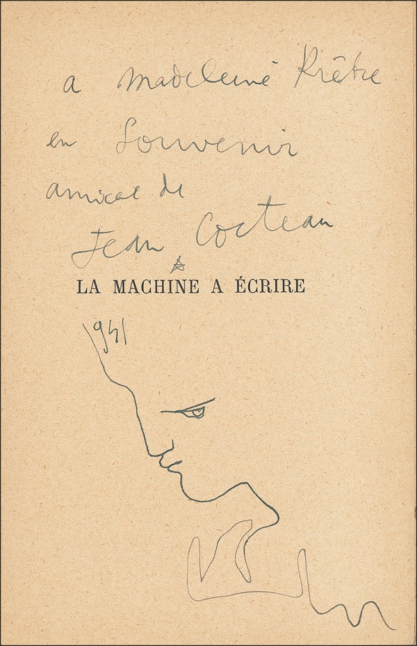 Versatile French poet, playwright, film director, and artist (1889–1963); among his best-known works are the novel Les Enfants Terrible and the film La Belle et la Bête. Signed book: La Machine a Ecrire. No place: Gallimard. Softcover, 4.75 x 7.5, 212 pages. Signed and inscribed in black ink on the half-title page, “A Madeleine K— en souvenir amical de Jean Cocteau, 1941,” Cocteau adding his characteristic sketch of a figure in profile. A hint of mild soiling to covers and typical light, even toning to interior, otherwise fine, clean condition. R&R COA.