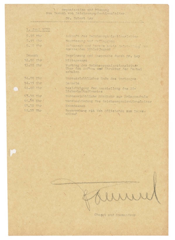 German field Marshall, nicknamed The Desert Fox for his tactical genius as Commander of the Afrika Korps. In 1944 he was implicated in a plot to assassinate Hitler; given the choice of suicide or trial, he took poison. DS, in German, signed in pencil “Rommel,” one page, 8.25 x 12, June 1939. Document signed by Rommel as head of the German Tank Academy, and mentioning Dr. Robert Ley at the top, boldly signed in pencil at the bottom by Rommel. In fine condition, with punch holes to left edge, some light toning and foxing, and a couple corner creases. Auction LOA John Reznikoff/PSA/DNA and R&R COA.