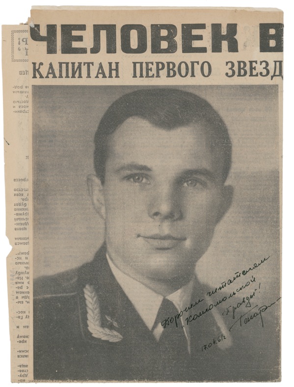 Russian cosmonaut (1934–1968) who, in 1961, became the first man in outer space and the first to orbit the earth. Large and handsome vintage 7.5 x 11 Russian newspaper photo, signed and inscribed in black ink in Russian and dated April 17, 1962. In fine condition, with a few small edge tears and a bit of light toning. R&R COA.
