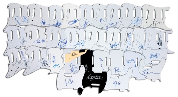 Thirty-two signed pickguards, for both Stratocaster and Telecaster style guitars, each signed in ink or felt tip by a different performer. Signers are: Marty Balin, Brian Wilson, Lou Reed, Boyd Tinsley, Nick Mason, John Frusciante, Roger Waters, Olivia Newton-John, Sonny Rollins, James Taylor, Les Paul, Spencer Davis, Steven Tyler, Izzy Stradlin and Steven Adler, Kevin Bacon, Muse (all three members), Kent Smith and Bernard Fowler (Rolling Stones back-up band), Steven Adler, Stewart Copeland, Richie Blackmore, Rob Halford, Mike Love, Nikki Sixx, Billie Joe Armstrong, Ben Harper, David Bryan, Country Joe McDonald, John Waite, Marty Balin and Jorma Kaukonen, and three others. In fine condition. R&R COA.