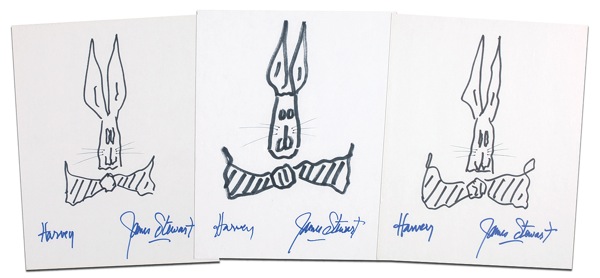 Three original felt tip sketches of Harvey the Rabbit on individual off-white 8 x 10 cards, each signed at the bottom, “James Stewart,” and “Harvey.” In very fine condition. R&R COA.